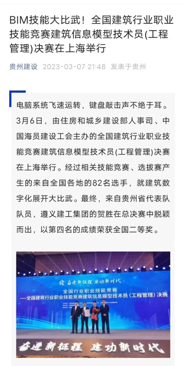 2023年3月7日,由住房和城乡建设部人事司、中国就业培训技术指导中心、中国海员建设工会主办的全国建筑行业职业技能竞赛建筑信息模型决赛在上海圆满结束。
