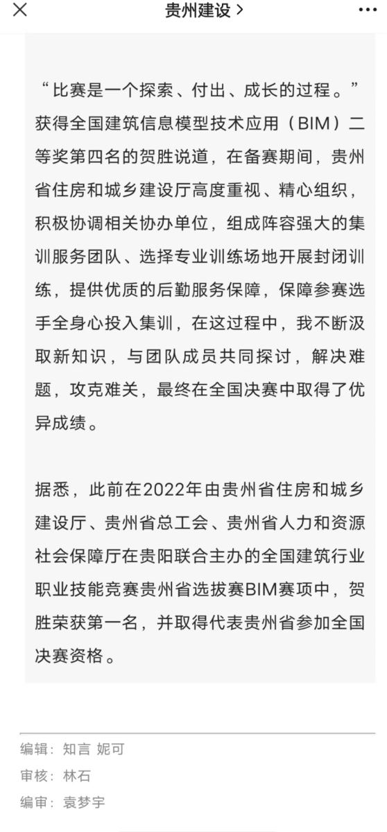 此前,在2022年11月由贵州省住房和城乡建设厅、贵州省总工会、贵州省人力资源和社会保障厅联合举办的全国建筑行业职业技能竞赛贵州省选拔赛中,贺胜就取得了第一名的优异成绩,被授予“全省住房城乡建设系统贵州建设工匠”荣誉称号。此次是代表贵州省在全国决赛中参与角逐。