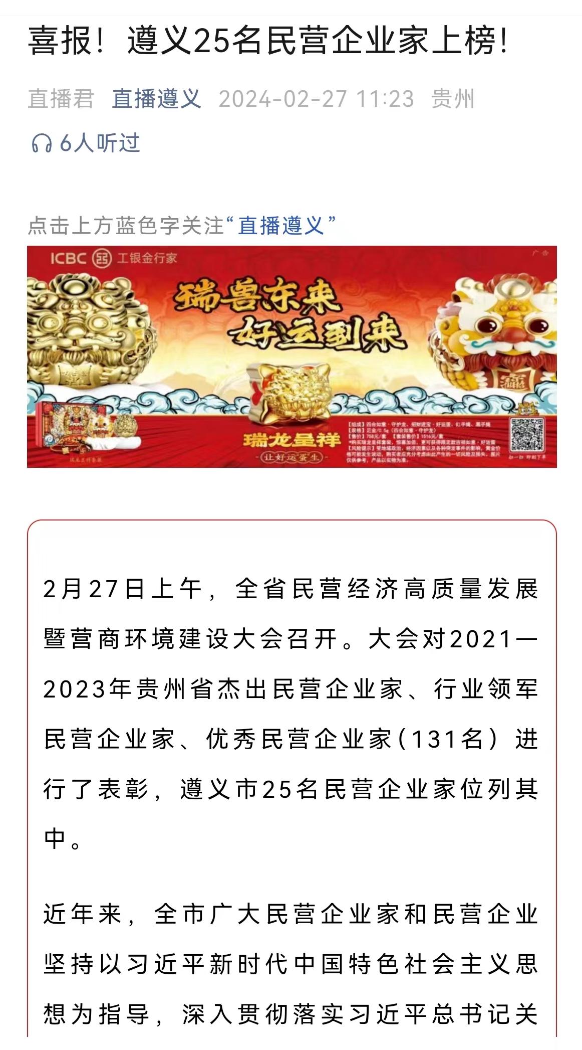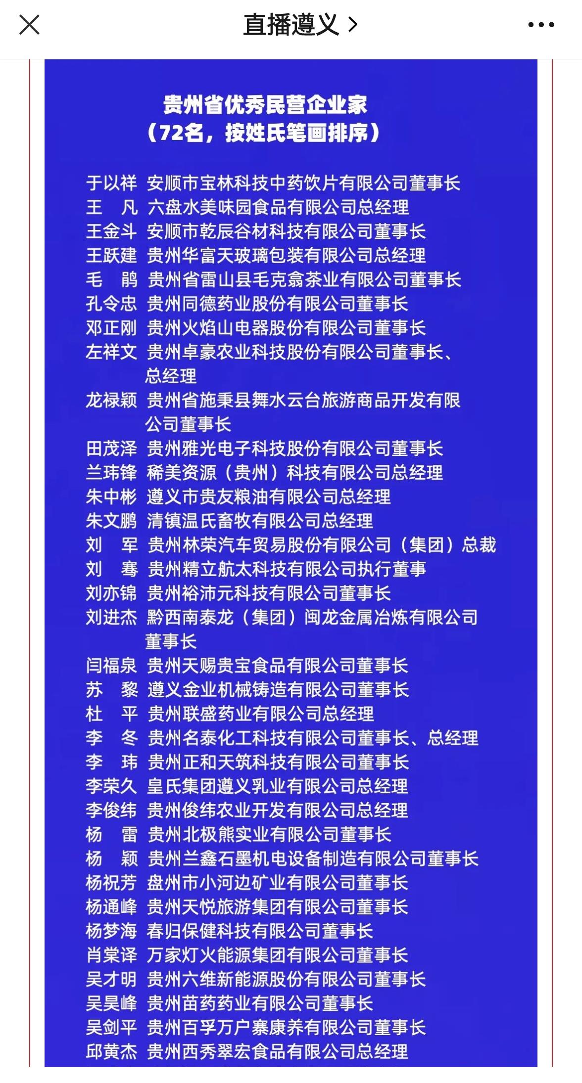 2月27日上午,全省民营经济高质量发展暨营商环境建设大会召开。大会对2021—2023年贵州省杰出民营企业家、行业领军民营企业家、优秀民营企业家(131名)进行了表彰。遵义建工(集团)有限公司董事长徐四清荣获“贵州省优秀民营企业家”称号。